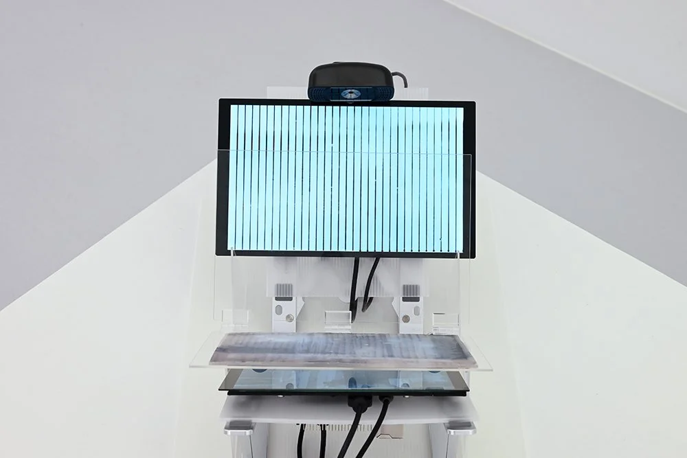 Acrylic sheets, digital screens (7” and 10”), webcam, cables, metal supports, single board computers, and ink and paper in wax-resin composite
