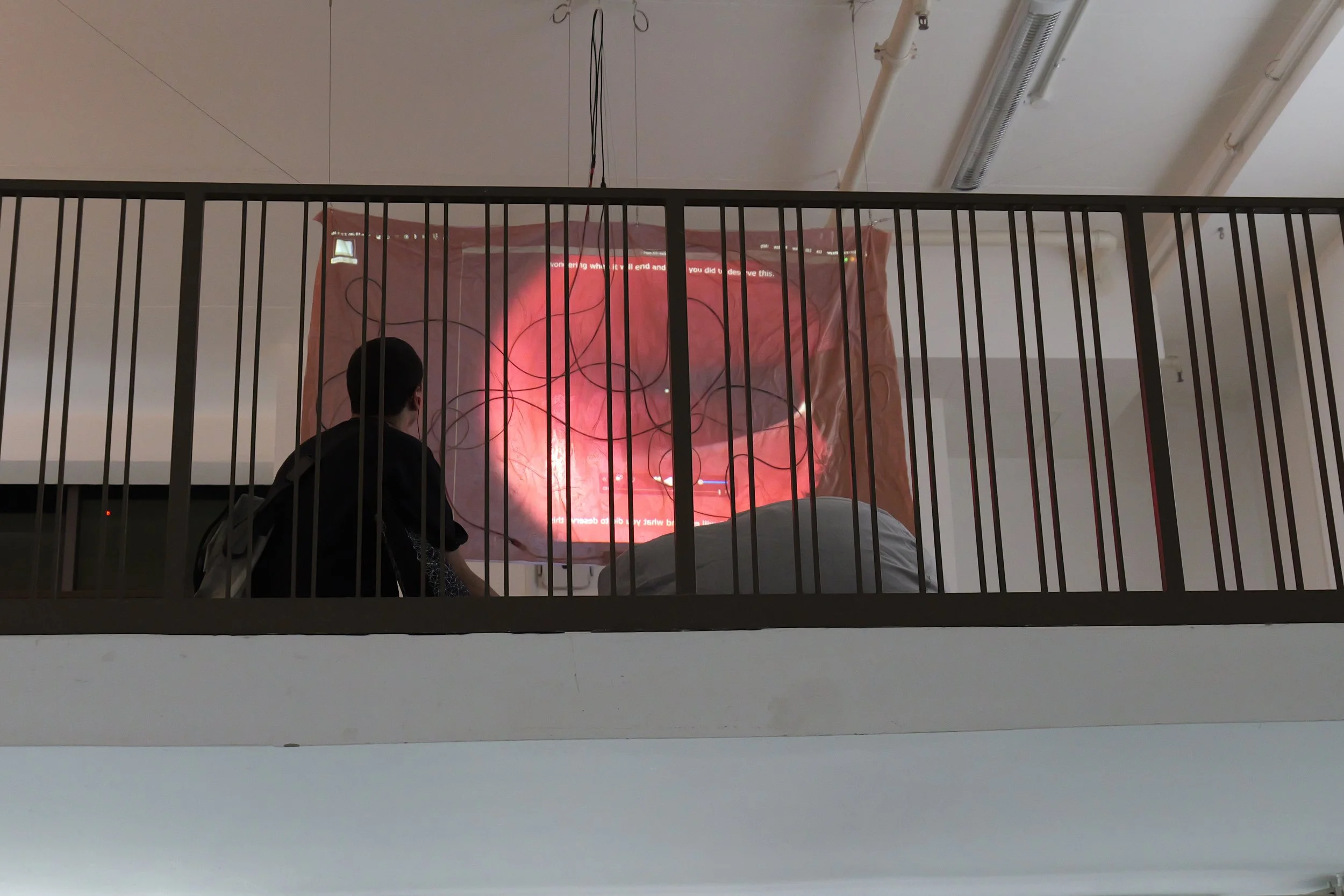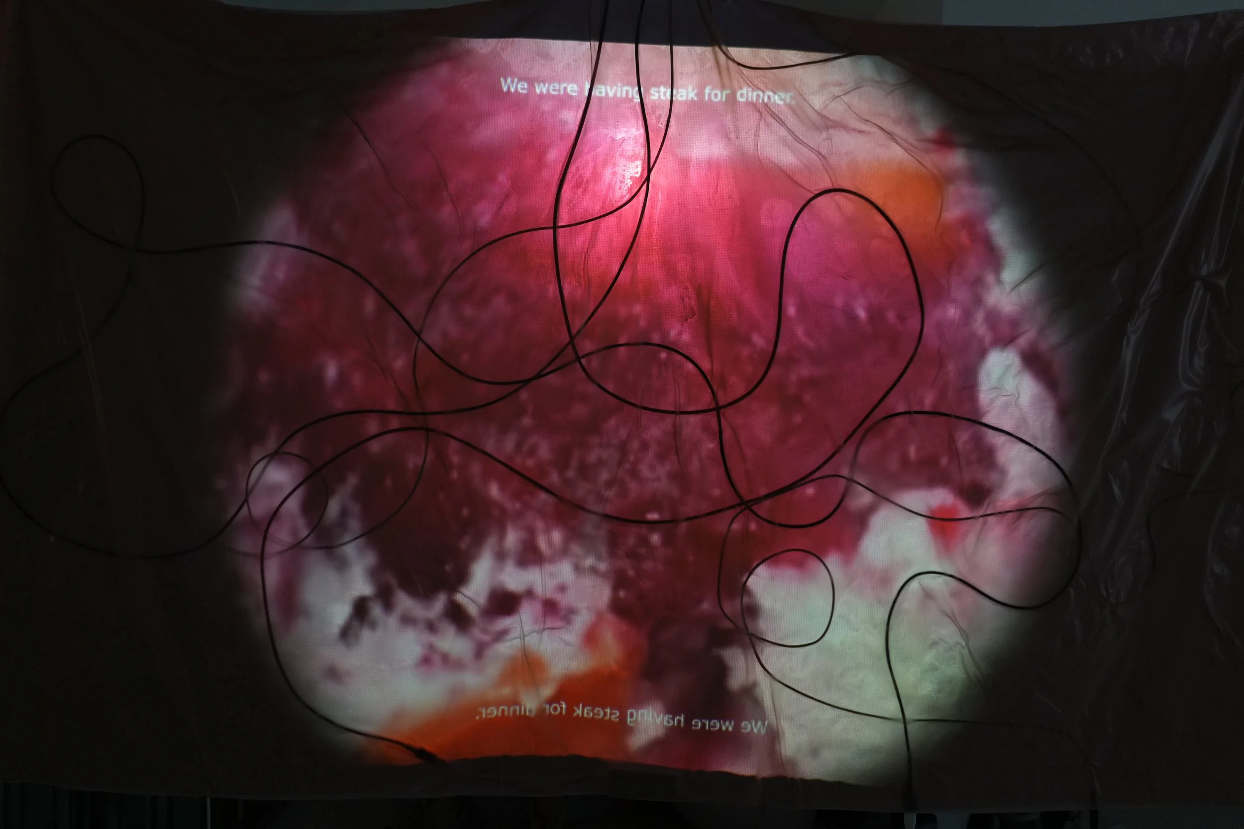 Flesh Drive is a video installation that treats the human body as both an interface and a spectacle of consumption. Projected onto a fleshy soft latex screen embedded with vein-like wiring, the work oscillates between a journey through a digestive tract and an avatar performing an ASMR mukbang.