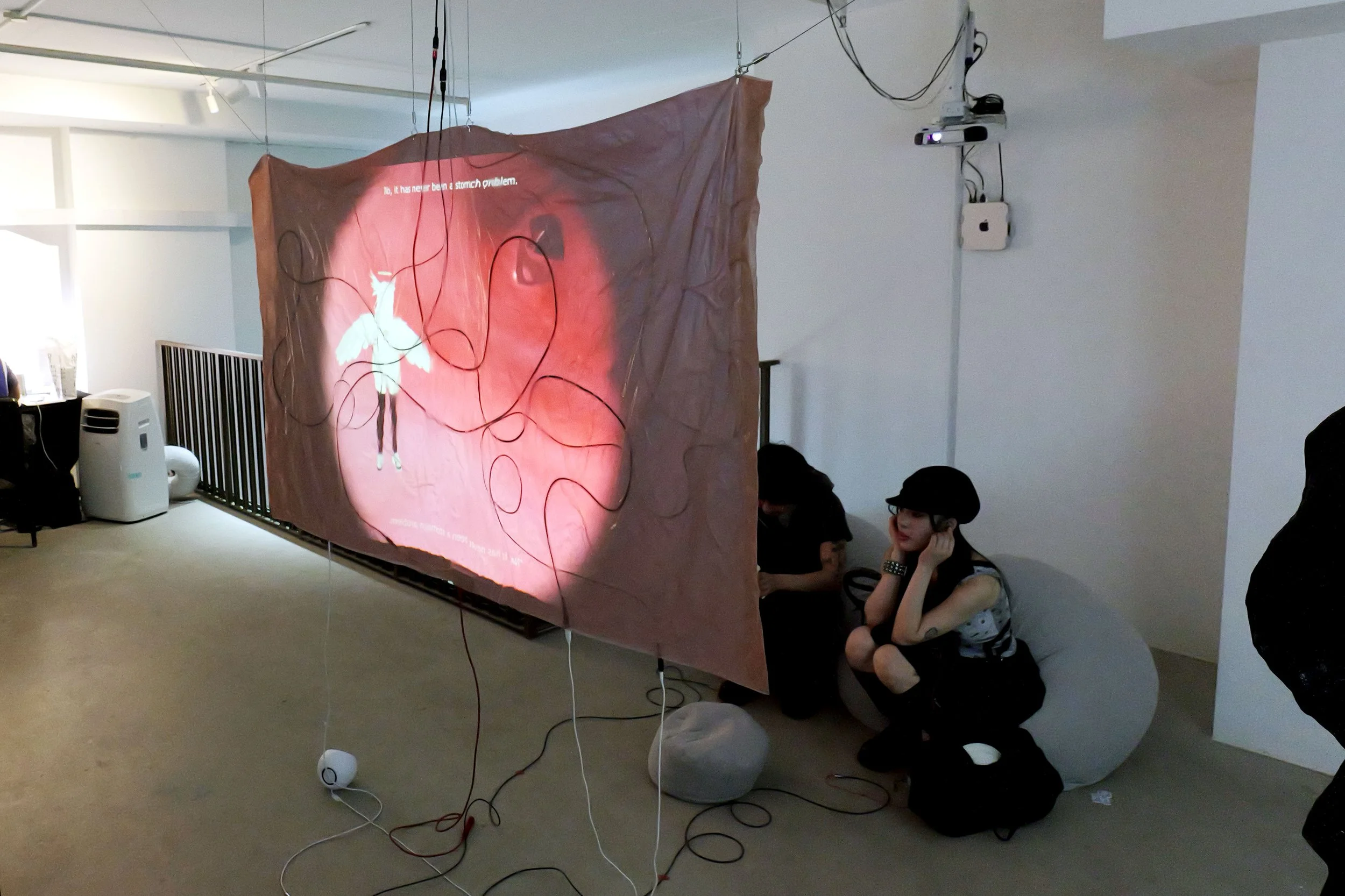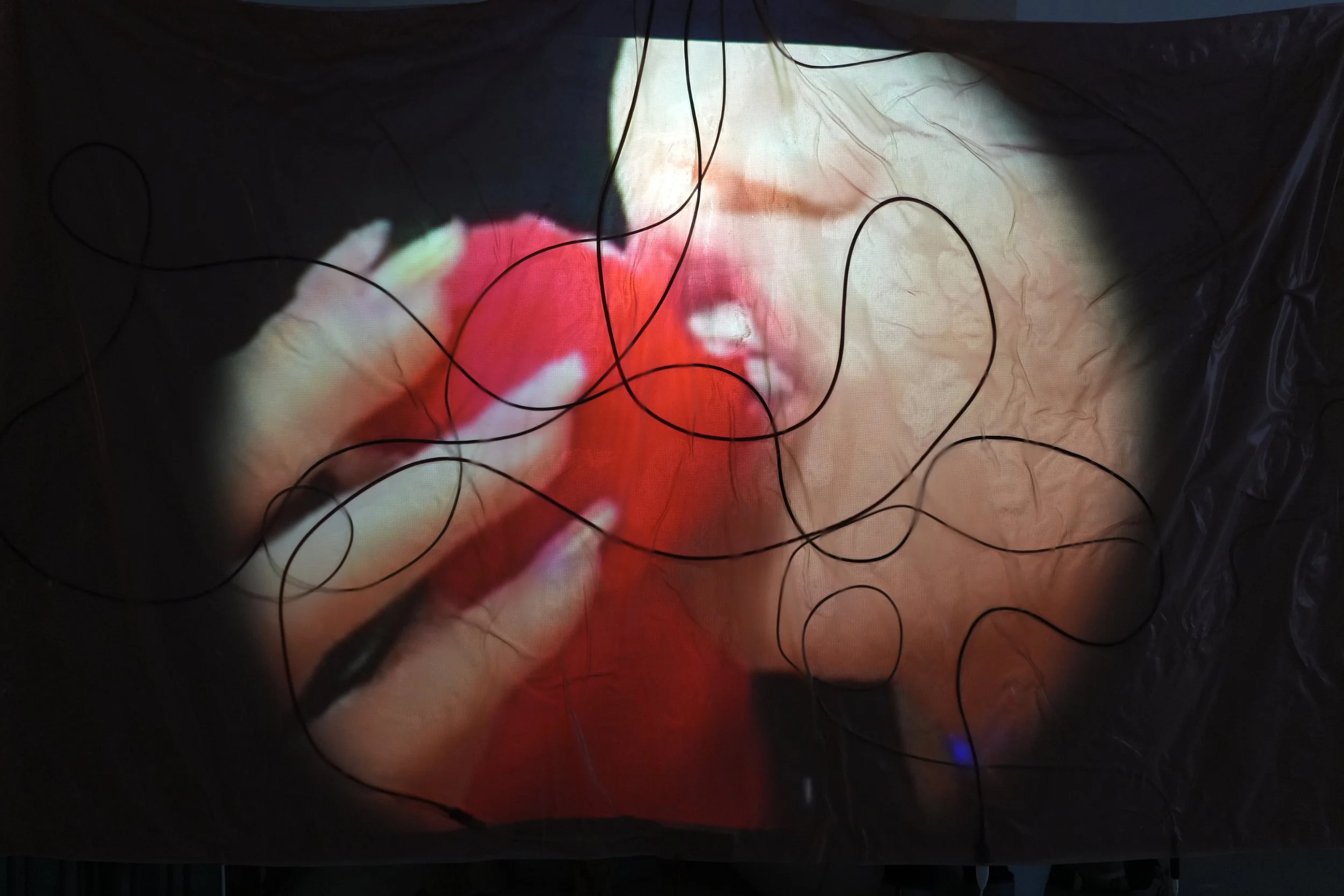 Video projection, silicone/rubber screen, audio, wires, flash drives, headphones